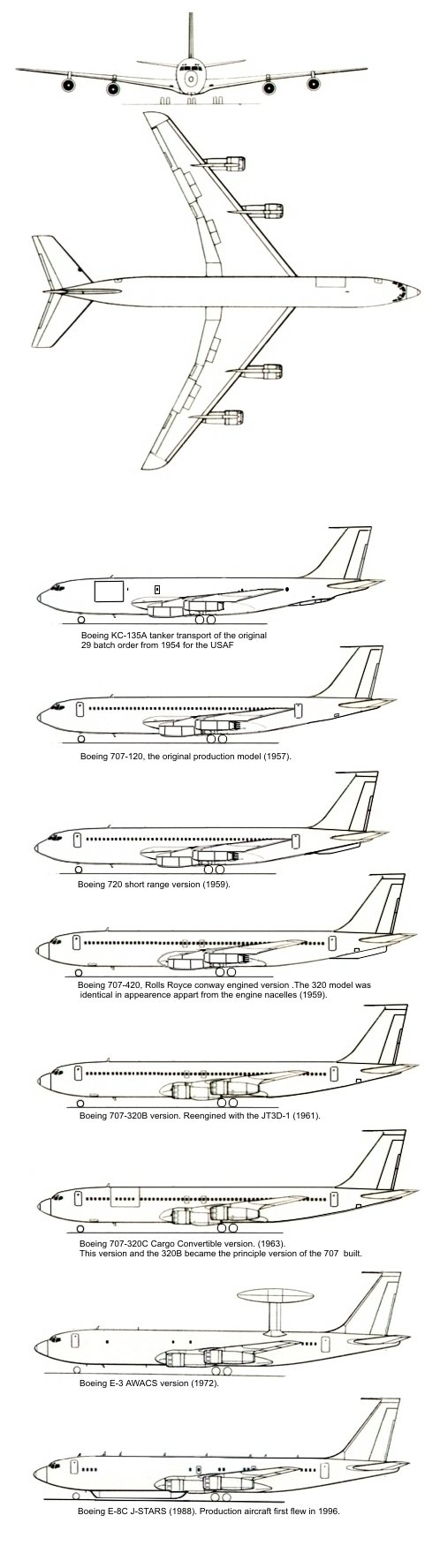 | 707-220 | four JT4A-3 | 15,800 lb(7167 kg) | 3,340 mls (5,375 km) | 4 crew 181 pas | 37,500 ft (11,430 m) | 605 mph (972 km/h) |